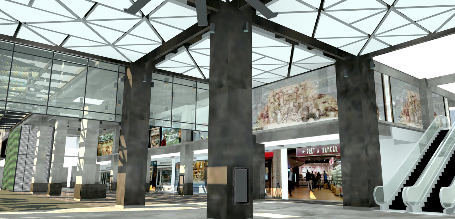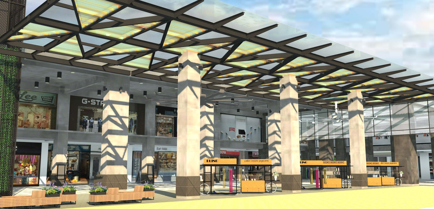 Ever heard of a monochromatic kaleidoscope? Well, now you have. That’s the image that the geometric shapes on Utropolis’s floor and ceiling are meant to evoke. We also created bespoke pushcarts out of OSB boards and bicycle wheels for the vendors. The vibe is young and DIY chic, just like the shoppers who frequent this neighborhood hub.